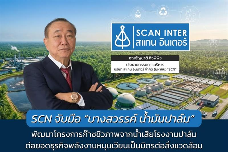 นายธัญชาติ กิจพิพิธ ประธานกรรมการบริหาร บริษัท สแกน อินเตอร์ จำกัด (มหาชน) หรือ SCN เปิดเผยว่า บริษัท สแกน ชีวาแก๊ส จำกัด ซึ่งเป็นบริษัทในเครือ ได้ลงนามบันทึกข้อตกลงความร่วมมือ (MOU) กับบริษัท บางสวรรค์ น้ำมันปาล์ม จำกัด เพื่อร่วมพัฒนาโครงการผลิตก๊าซชีวภาพจากน้ำเสียที่เกิดจากกระบวนการผลิตปาล์มน้ำมัน โดยมีเป้าหมายในการนำของเสียจากภาคอุตสาหกรรมมาพัฒนาเป็นพลังงานทดแทน และยกระดับการบริหารจัดการพลังงานในภาคอุตสาหกรรมให้มีประสิทธิภาพมากยิ่งขึ้น